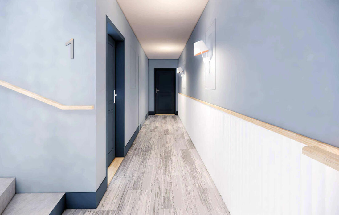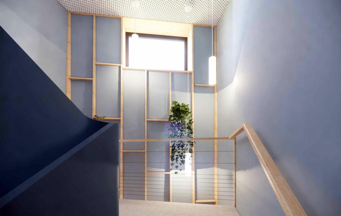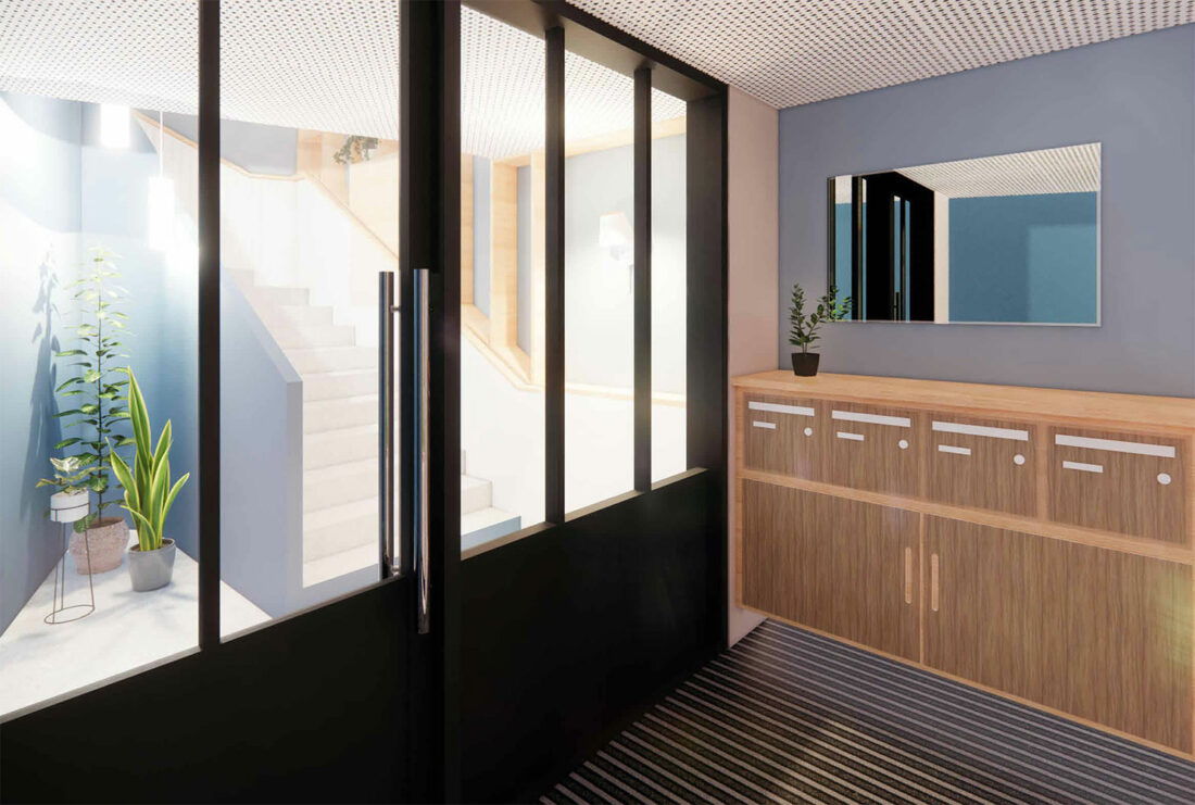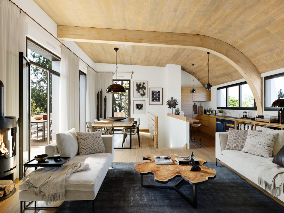 Construction mixte bois béton avec séjours des duplex sous charpente courbe
